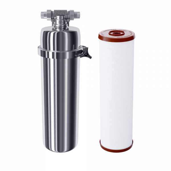 Магистральный фильтр из нержавеющей стали со сменным полипропиленовым модулем. Обеспечивает базовую предочистку воды во всей квартире, при этом напор остается практически без изменений.