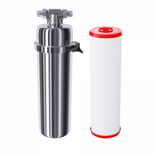 Магистральный фильтр из нержавеющей стали со сменным полипропиленовым модулем. Модуль рассчитан на воду температурой до +75°С. Обеспечивает базовую предочистку воды во всей квартире, при этом напор остается практически без изменений.